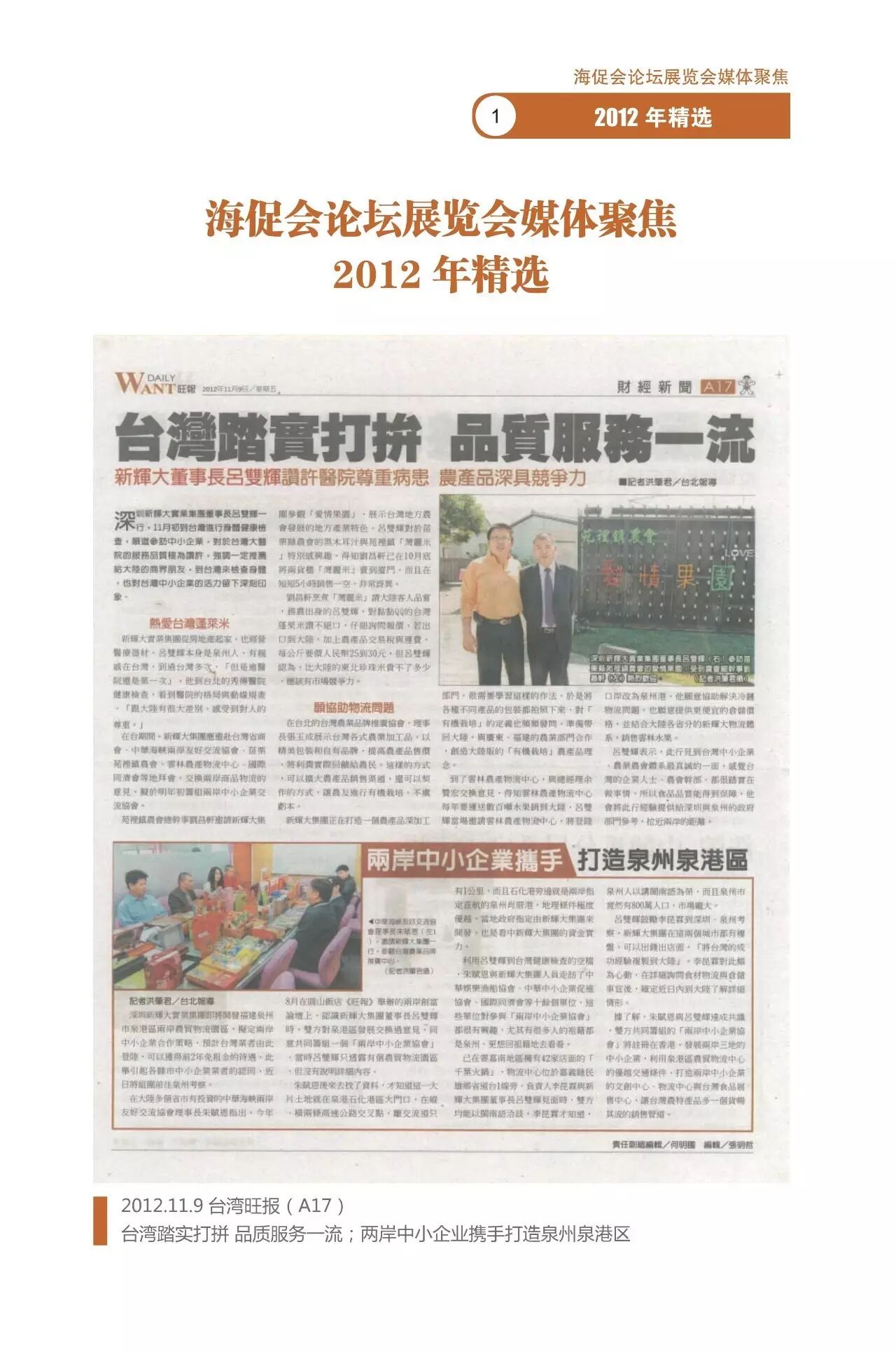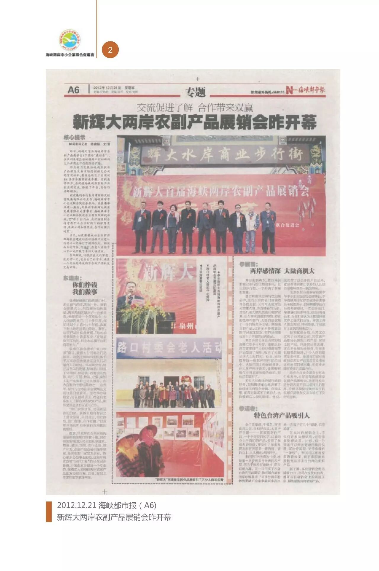 由深圳市新辉大实业发展有限公司董事长吕双辉为主要创会发起人,並联合大陆和臺湾各30家有影响的中小企业共同发起並作为首批会员单位,在香港註册成立 「海峡两岸中小企业联合促进会」现已正式批復(以下简称海促会),旨在吸引海峡两岸从事农副產品与相关產业的企业加入,参与投资或纯经营「福建省海峡两岸农副產品交易市场」,该名称已经工商局核准註册。
